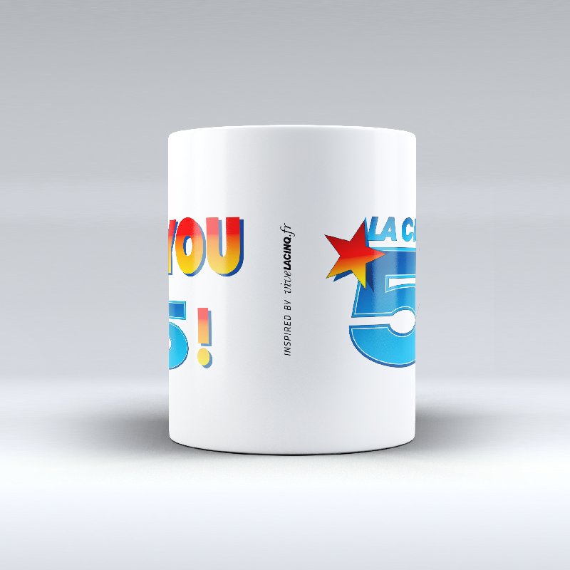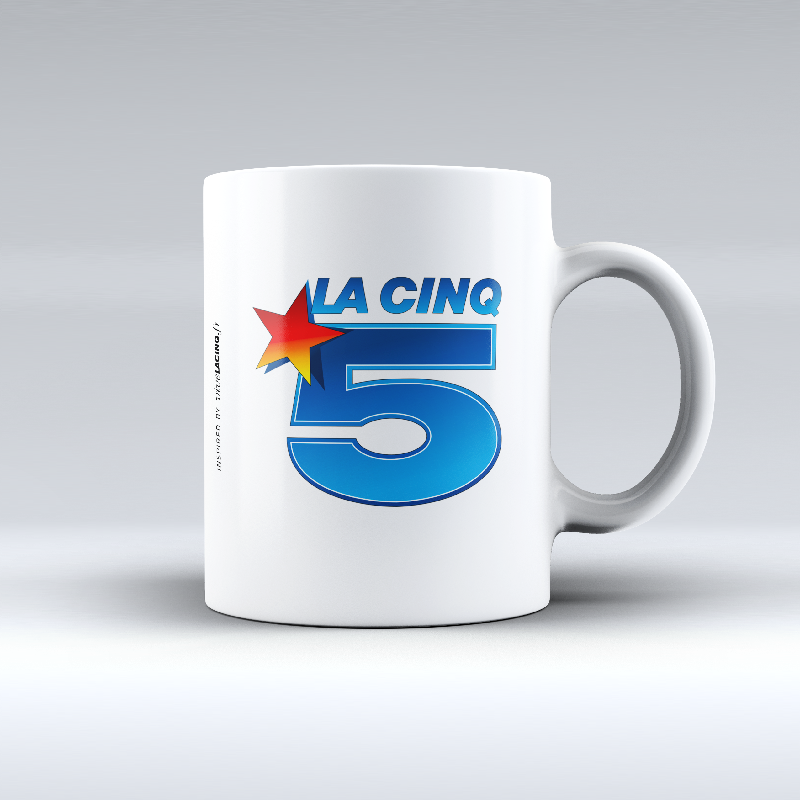Mug blanc 325 ml – Impression recto “Cinq You La 5 !” et logo La Cinq au verso.