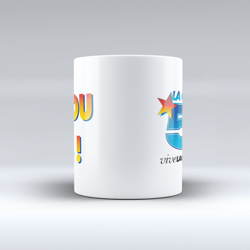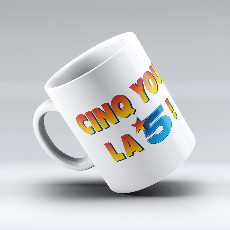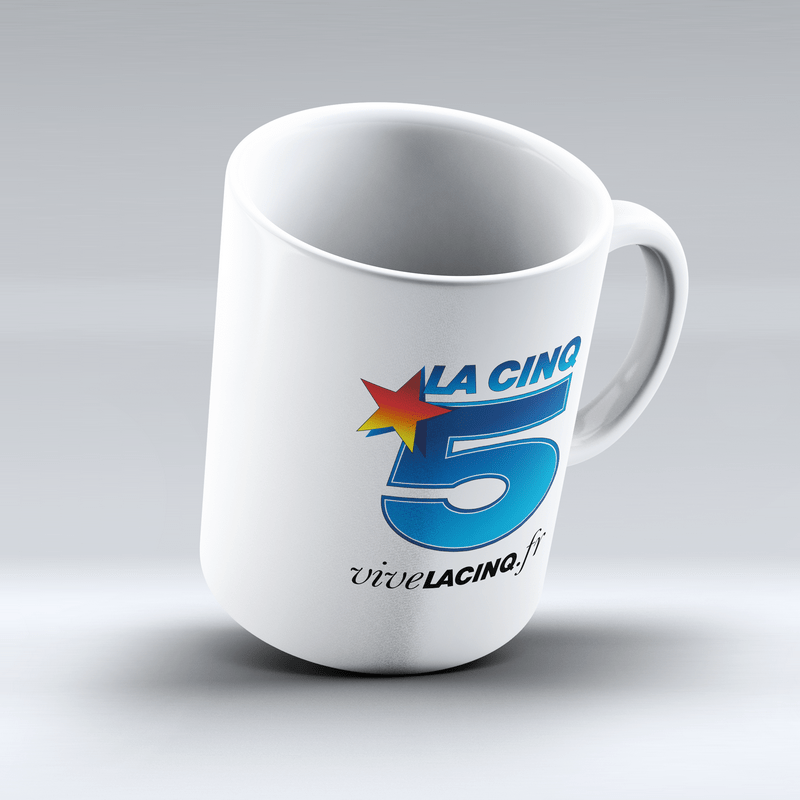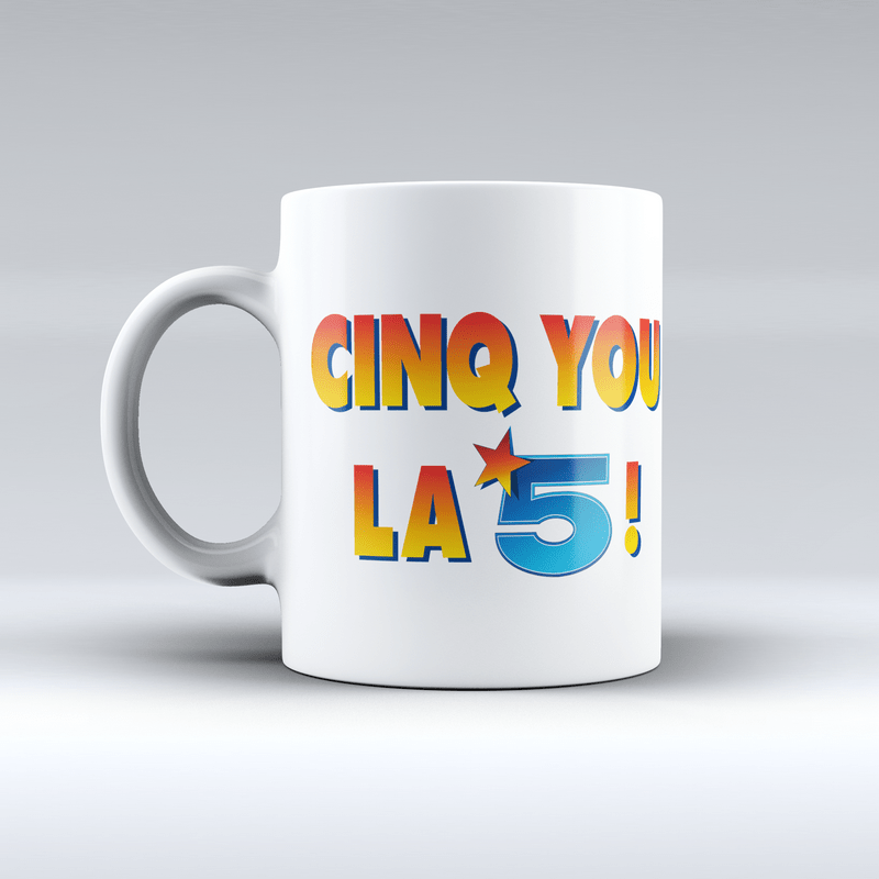 Mug Blanc Contenance 325 ml – Impression en sublimation Recto “Cinq You La 5 !” et Logo La Cinq au Verso – Haute tenue Lave-vaisselle & Micro-ondes.