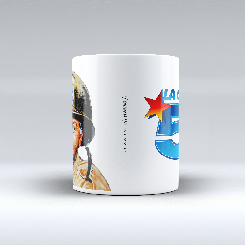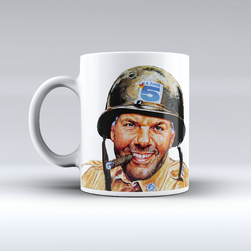 Mug blanc 325 ml – Impression recto “Jean-Claude Bourret soldat” et Logo La Cinq au verso.
