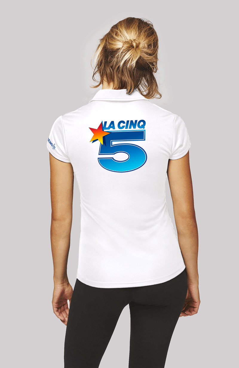Polo Blanc Coupe Femme 150g/m². Maille respirante à séchage rapide. Patte sans bouton. Finition double aiguille au bas du vêtement et manches. . Impression en sublimation du logo “La Cinq” cœur + dos et “vivelacinq.fr” sur la manche – Excellente tenue au lavage même à haute température.
